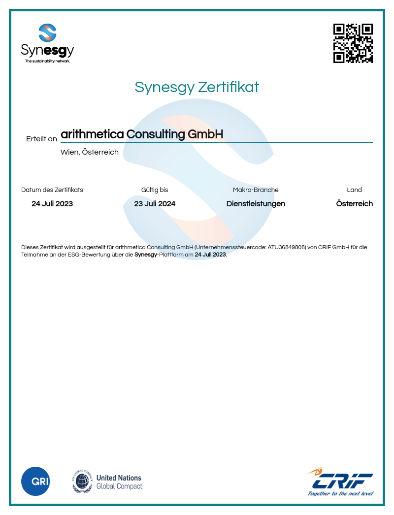 Nachhaltigkeit ist für arithmetica ein großes Anliegen und wir sind stolz auf unser ESG-Zertifikat. Diese Auszeichnung bestätigt unser Engagement für Umwelt, soziale Verantwortung und transparente Unternehmensführung.